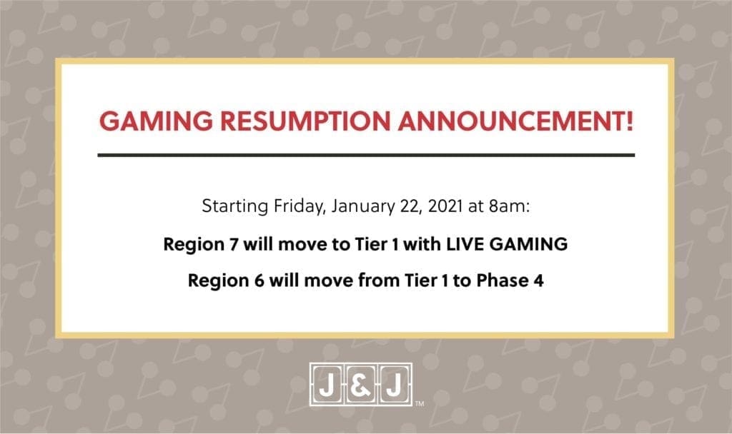 January 20, 2021 – Gaming Resumption Update: Region 7 returning to LIVE gaming and Region 6 entering Phase 4!