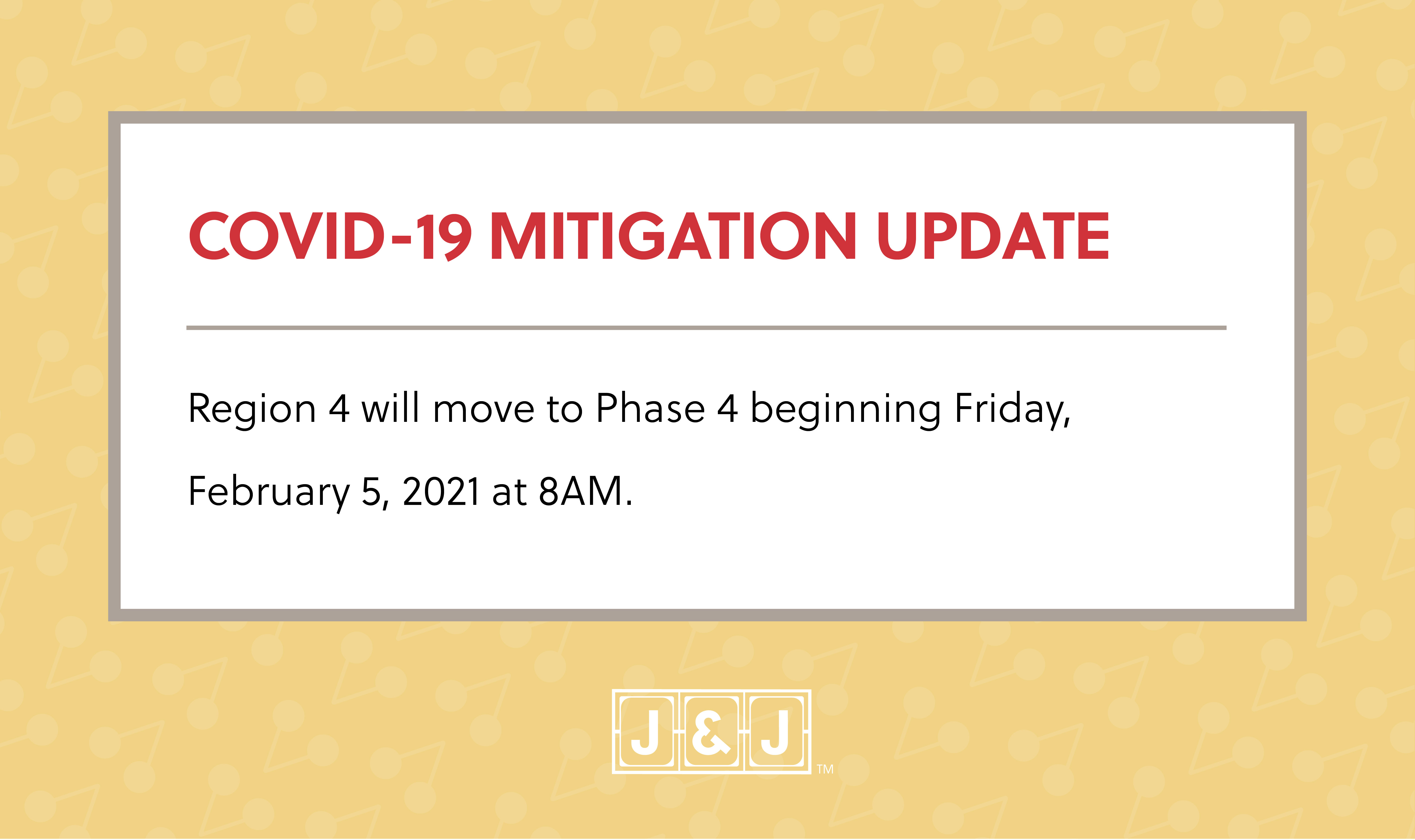 February 4, 2021 – Region 4 will move to Phase 4 February 5, 2021at 8AM!