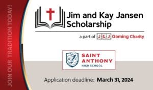 The purpose of the Jim & Kay Jansen scholarship is to continue to broaden the appeal of St. Anthony High School culture and curriculum throughout South Central Illinois. Download the application here, at stanthony.com, or pick an application up at the St. Anthony Parish offices located at 101 E. Virginia Avenue in Effingham, IL.