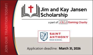 J&J Gaming Charity is proud to announce the opening of the 9th annual, Jim & Kay Jansen Scholarship for the 2026-2027 school year. Started in 2018, Jim & Kay Jansen and Family started the Scholarship fund to award 100% of tuition and fees for four years of education at St. Anthony High School. The Scholarship has been awarded to six incoming freshmen, per year, who have not previously attended St. Anthony Grade School. To date, the Jim & Kay Jansen Scholarship has supported over 60 students in pursuing education excellence at St. Anthony High School.